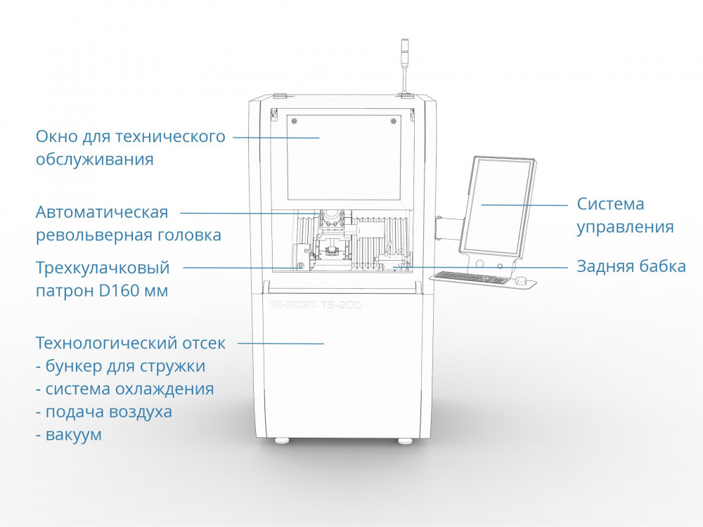 Малогабаритный токарный станок с ЧПУ M-ROBO TS-200 - это промышленное оборудование, предназначенное для обработки цилиндрических, конических и сферических поверхностей, торцов, канавок и фасок, нарезания различных видов цилиндрической и конической резьбы цветных металлов и их сплавов в условиях серийного производства.